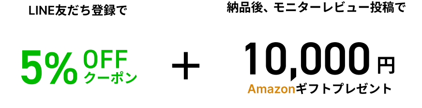 10,000円分進呈商品到着後に届くメールまたはLINEに記載されたURLからレビューを投稿していただくと、もれなく10,000円をAmazonギフトカードを進呈します。