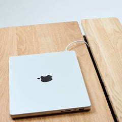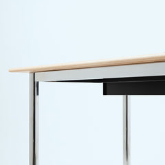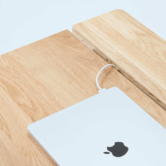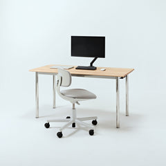 オーク天板の脚には、ステンレススチールを採用。美しさと耐久性を兼ね備えたマテリアルが、ワークスペースに洗練をもたらします。