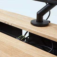 天板後部の固定天板と、手前のスライド天板の間には配線用のスリットを実装。天板を閉じた状態でも必要なケーブルのみ机上に出せるため、充電や外部モニターへ接続するケーブルもすっきりと整えられます。