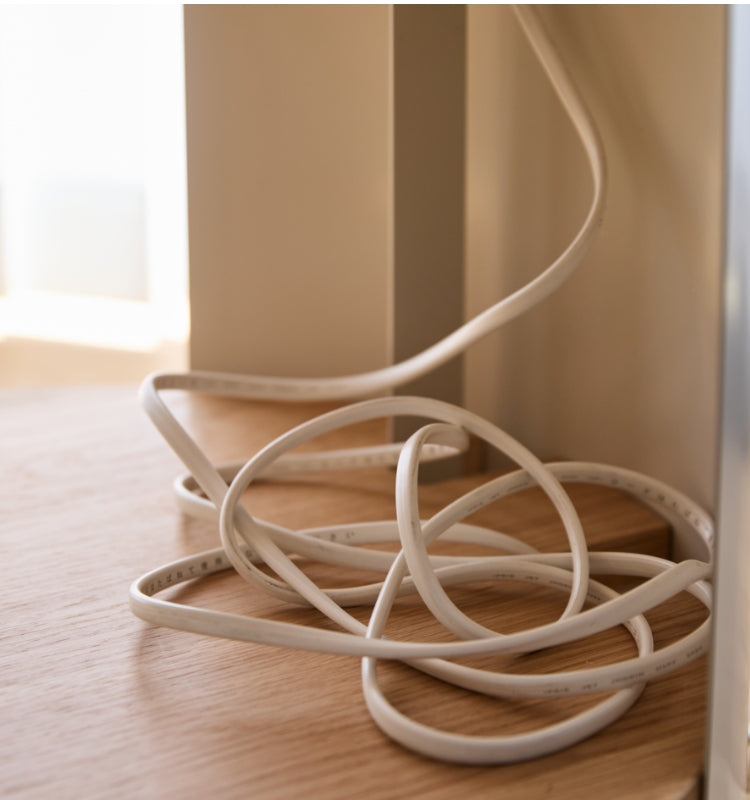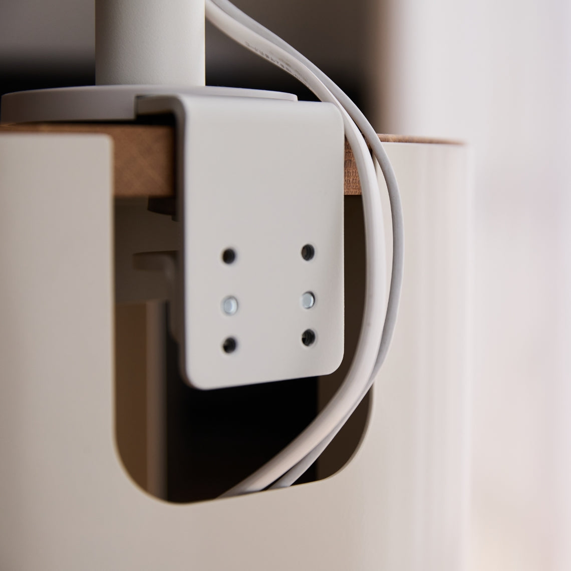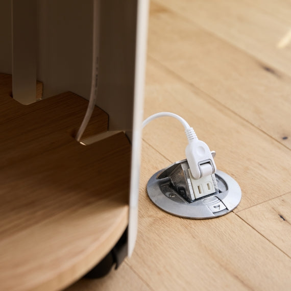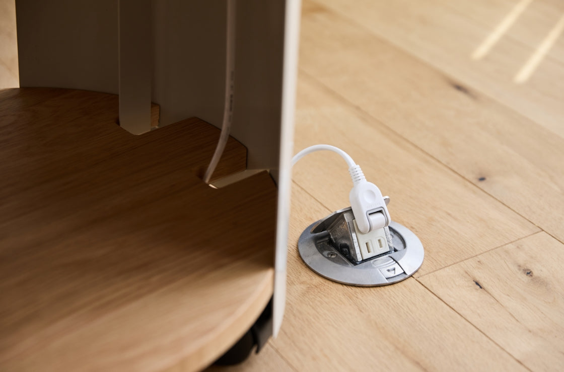 WAAKwagon COLUMNにコンセントタップを取り付ける場合も、大もとの電源は必要です。足元からしっぽのようにケーブルを通せるので、壁や床のコンセントまで最短距離で配線できます。