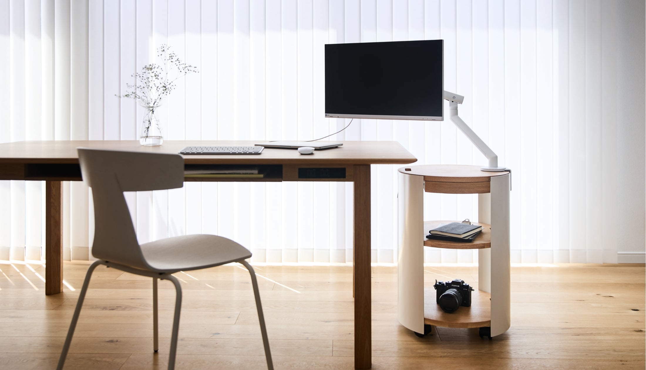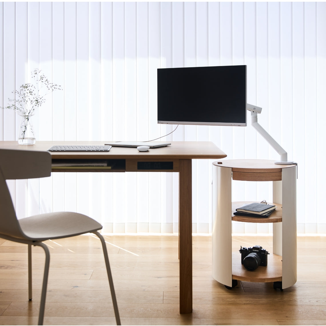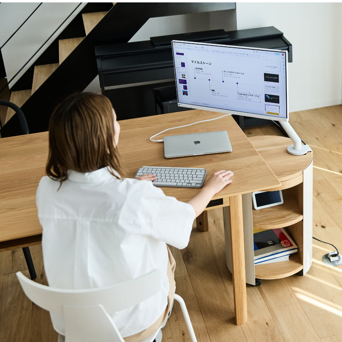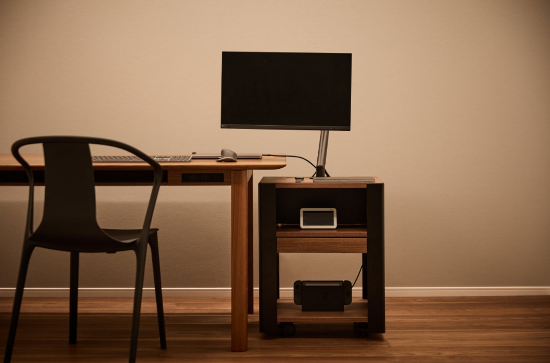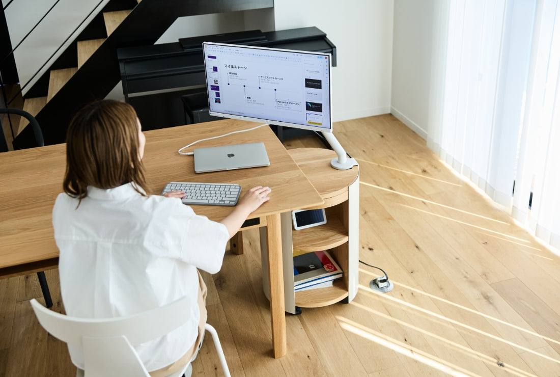 ワゴンにモニターアームを取り付けられるため、ダイニングテーブルはすっきり広々。