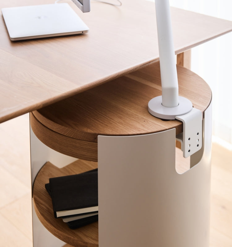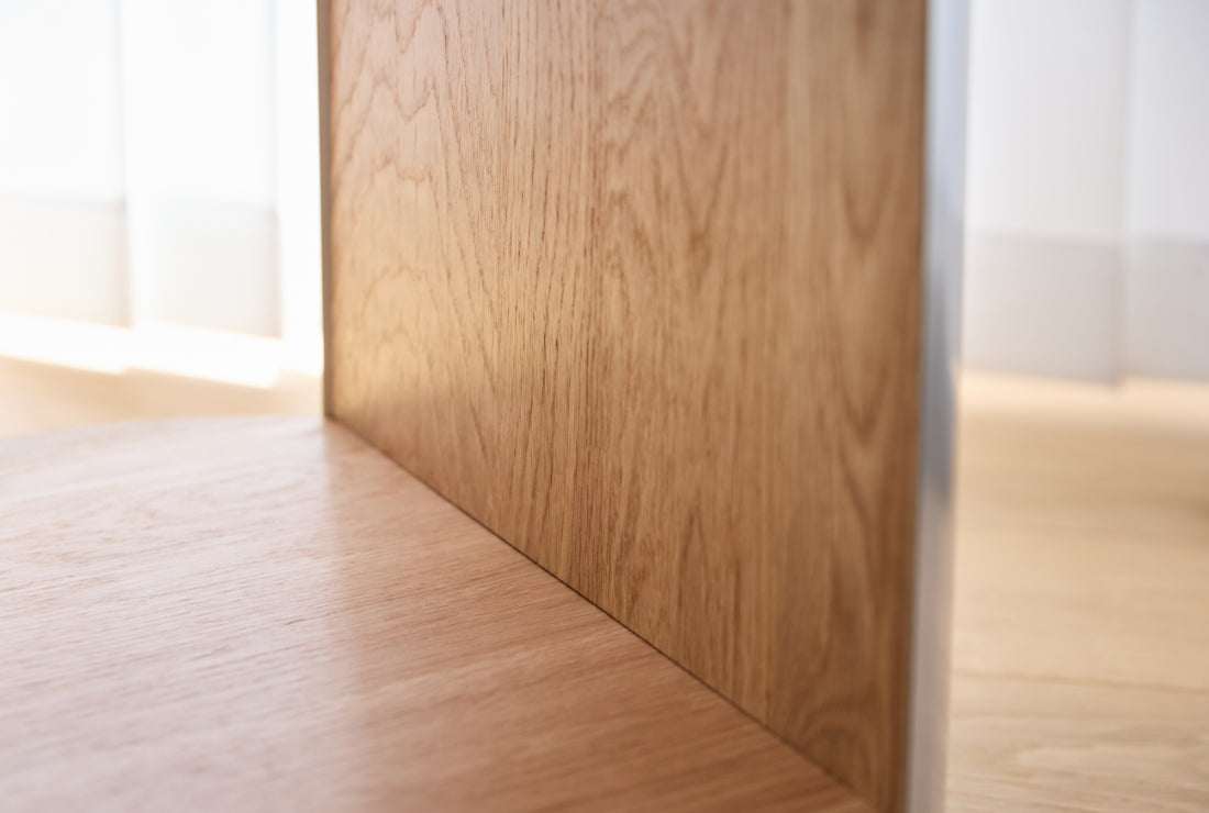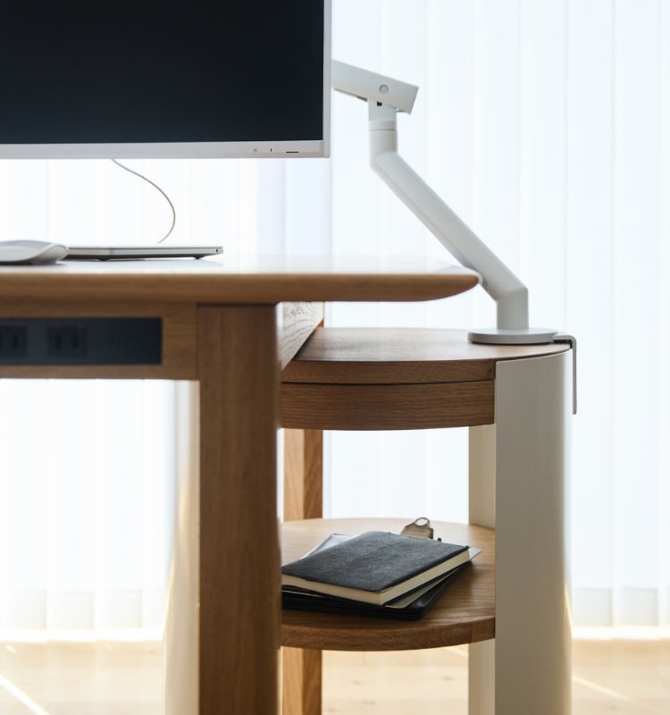 オーク無垢材とグレージュ色のボディの組み合わせによる流麗なフォルムは、モダンインテリアの家具や空間に調和します。
