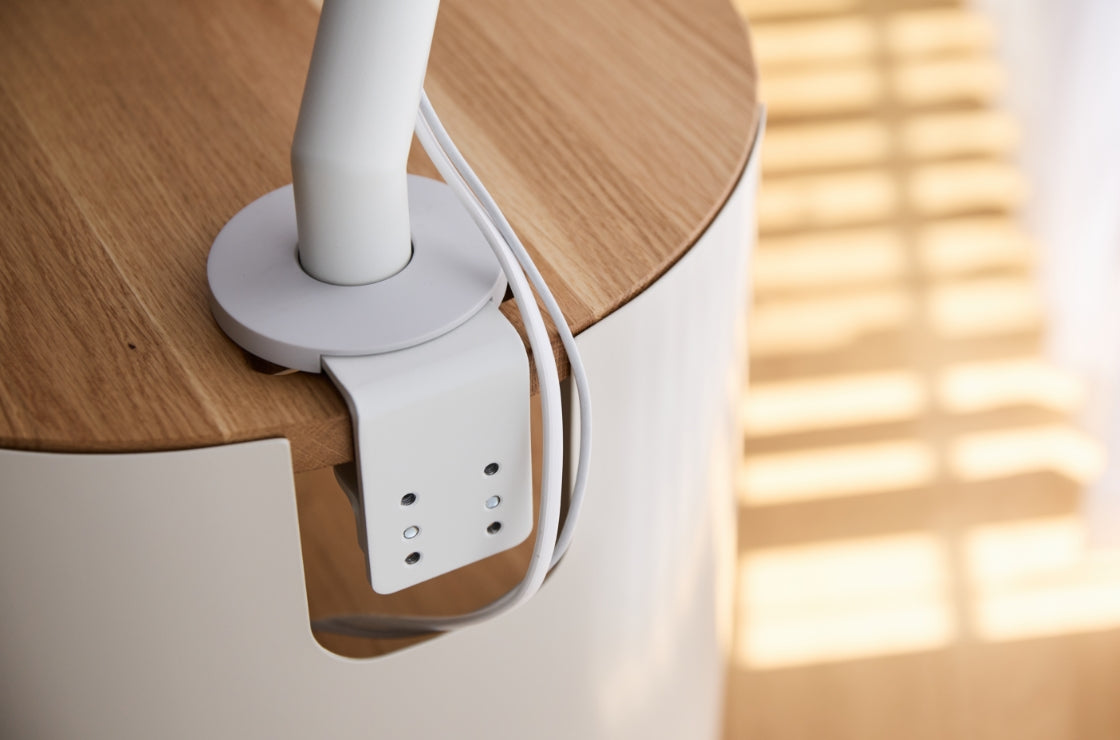 配線もこの1台ですべて収まります。モニターアームを取り付けるための開口部は大きく、多くのメーカーのモニターアームが取付可能です。