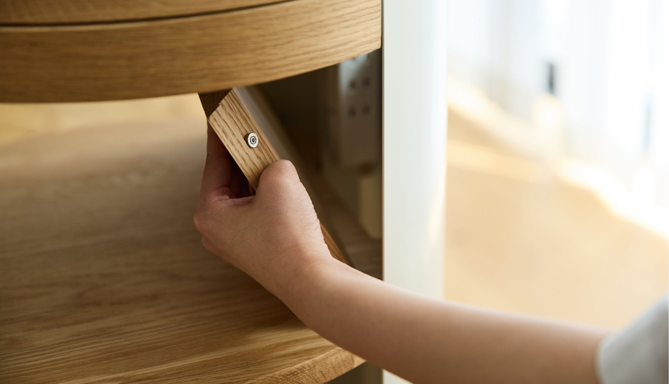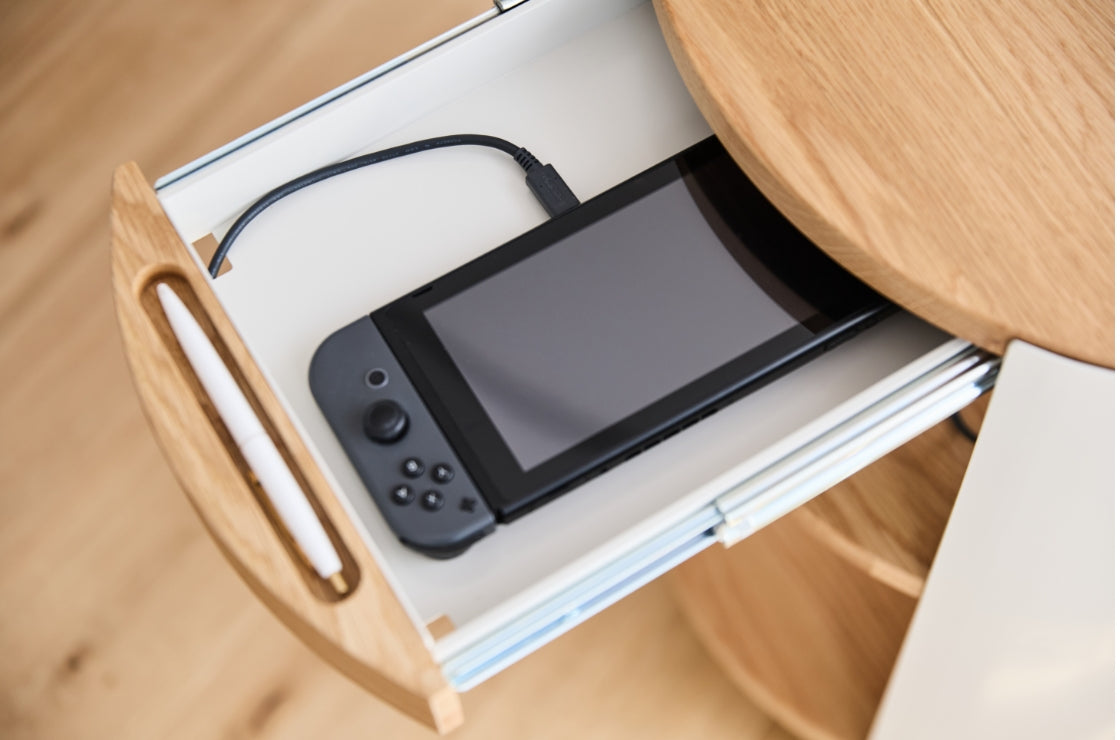 引き出しの端部には配線用の孔が開いているため、収納したまま機器の充電が可能です。