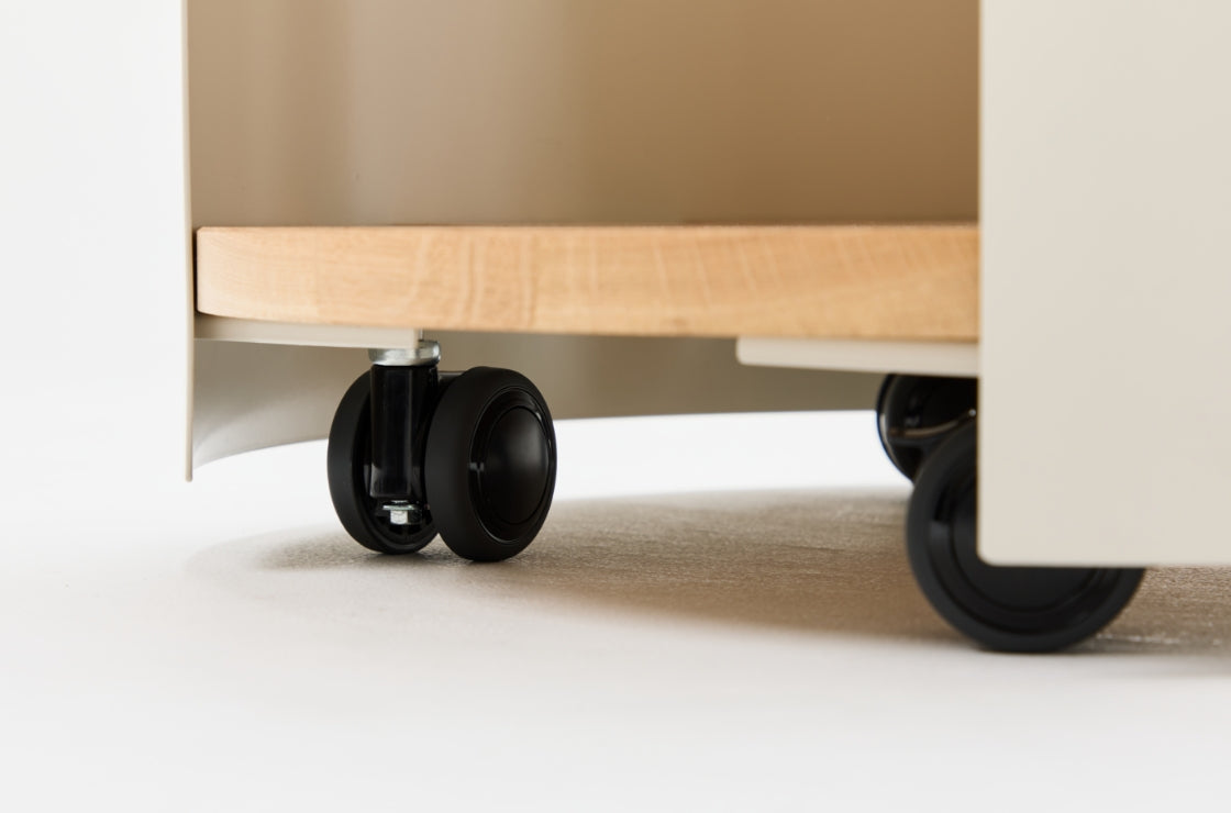 WAAKwagon COLUMNにはいつでもサッと動かせるようキャスターが付いています。住宅での使用を考慮し、床へキズや汚れが付きにくい日本製のポリウレタンキャスターを採用しています。