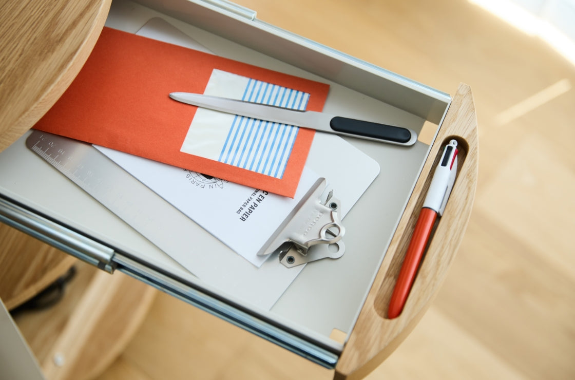 WAAKwagon COLUMNの天板下に取り付けられた浅い引き出しは、そんな紙類をサッとしまえます。前板に小さなペントレイも付いているので、サインが必要なときにも便利です。