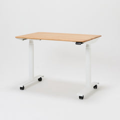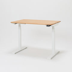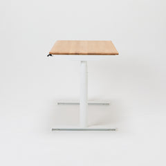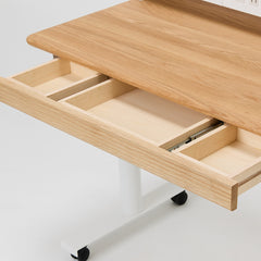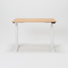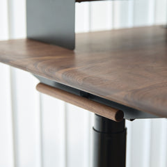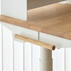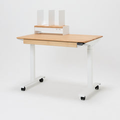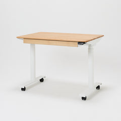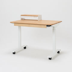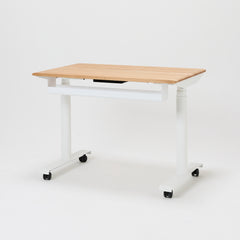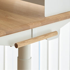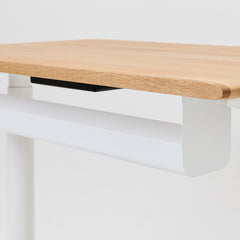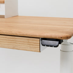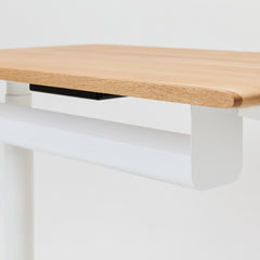 北欧の家具にも多く使われている、温かみのあるオークの無垢集成材天板と、プレディデスクだけの円筒形の白の昇降脚の組み合わせによる、洗練されたカラーリング。明るいリビングや、かわいい内装の子ども部屋にもぴったりです。