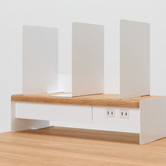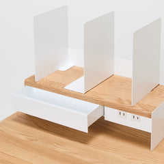 モニタースタンド、本や小物を置く場所、筆記具や消耗品の収納、デバイスの充電。デスク上でやりたいあれこれが、一台でできるシェルフです。後付けが可能な設計なので、成長や暮らしの変化に合わせて、購入後の必要になったタイミングで追加購入して、機能を拡張することもできます。