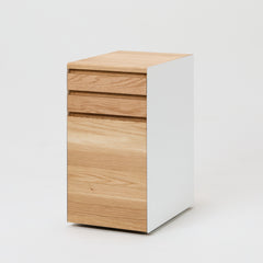 スチールと天然木無垢材のコントラストが美しい、デスクに合わせたデザインの専用サイドキャビネット。最下段の深引き出しにはA4のバインダーファイルを収納可能です。