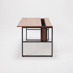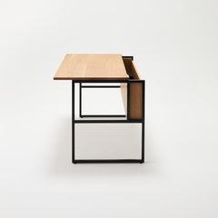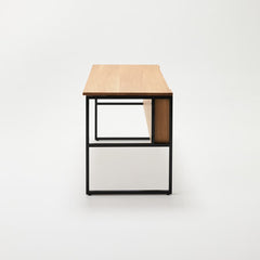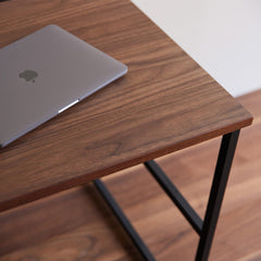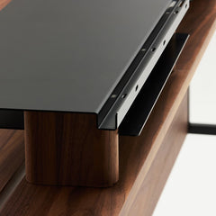 木製部分には家具の素材としても人気の高い、ウォールナットとオークをお選びいただけます。 天板の素材には、無垢材の質感と突板※の反りにくさをいいとこ取りした、厚さ0.5mmの"無垢突板"を採用。 ※突板(つきいた)…木材を0.2mm前後に薄くスライスしたもの。合板に貼り付けることで、家具の表面材として使用されます。無垢材に比べ木目の美しさや製品安定性に優れ、収納家具やテーブルなどに多用されています。