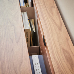 配線ボックス内は、2段構造になっています。可動式の浅めの棚は、主にコンセント専用。スチール製のため、裏側にマグネットが付いたコンセントはピタッとくっつけ動かなくできます。深めの棚底は、A4のファイルボックスが収納できる深さ。積み重ねてしまいがちな書類は、ガサッとここに仕舞い込みましょう。