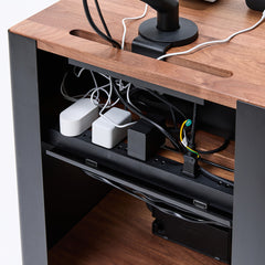 WAAKwagon CUBEは背面にチャージスペースを設けており、ここに市販のコンセントタップを入れることであらゆるガジェットの充電とケーブルの収納が可能に。USB-Cなど必要なコネクタ部分のみを表に出して使えるので、見た目にもスッキリと整います。